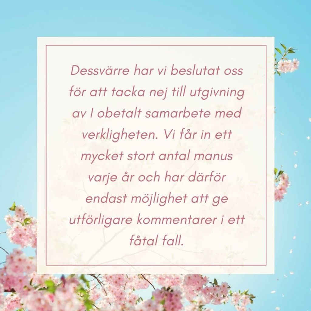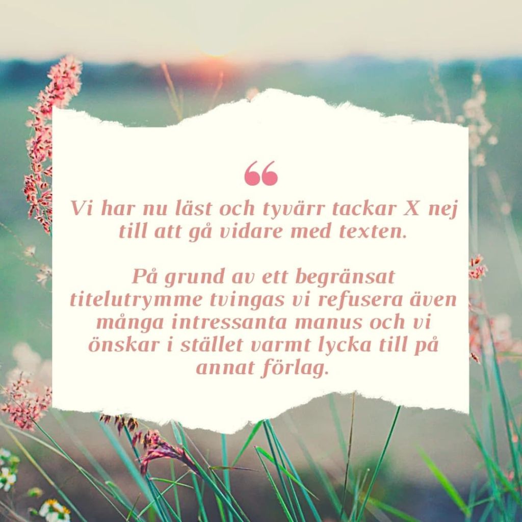 Sammanfattningsvis kan jag säga att denna upplevelse inte varit fullt lika skräckinjagande eller självförtroendedödande som jag fasat. En del av mig undrar varför det tog mig så lång tid att våga skicka manus till förlag, medan en annan är glad att jag äntligen satt bollen i rullning. Samtidigt är en tredje del av mig lite villrådig. Jag förstår att det inte går att skicka personlig feedback till alla manus som kommer in, men någonstans hade det varit intressant att veta vad det är som gör att de tackat nej. Har inledningen varit sömnmedel som fått dem att slänga manuset direkt i papperskorgen? Kan jag ens skriva? Är det mitt persongalleri som är orealistiskt, eller är det min dramaturgi som brister? Var jag ens i närheten, en röst som tippade beslutet åt fel håll (fast då hade det troligen kommit mer än en standardrefus?). Den krassa sanningen är att jag inte kan veta. Men jag kan försöka på nytt. Och kanske – kanske! – kommer svar från de sista förlagen.